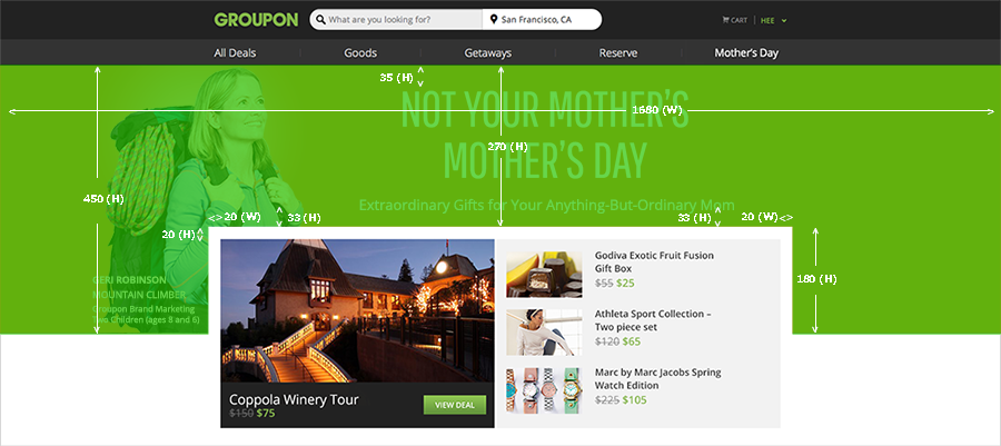 I art directed a photo shoot with seventeen different Groupon moms for this campaign from explorers to arm wrestling champions and used each mom in rotating headers with unique copy and type treatments.