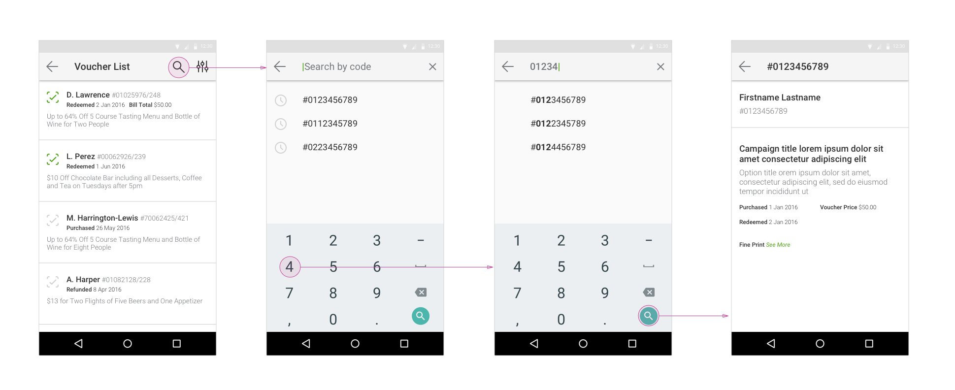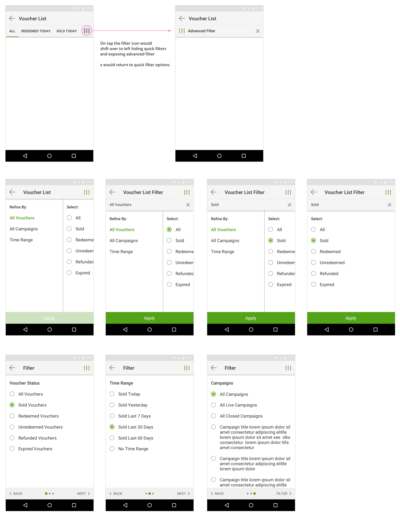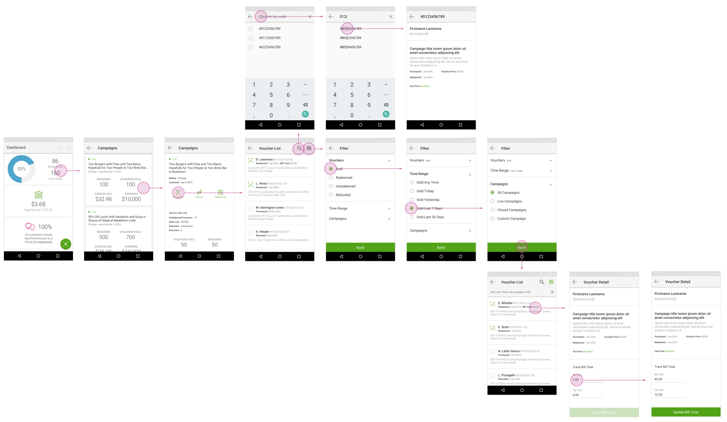 This flow shows the user entering the app dashboard and then navigating to a campaign card. The voucher list entry brings them to an unfiltered voucher list of all the vouchers for that campaign. The user can then filter by voucher status and time range to a smaller, more digestible list of vouchers. If the user wants to take any action on a voucher they can tap on one of the list items and will be brought into a voucher detail page. From here they can see all the details pertaining to that voucher, update bill and tip totals and redeem.